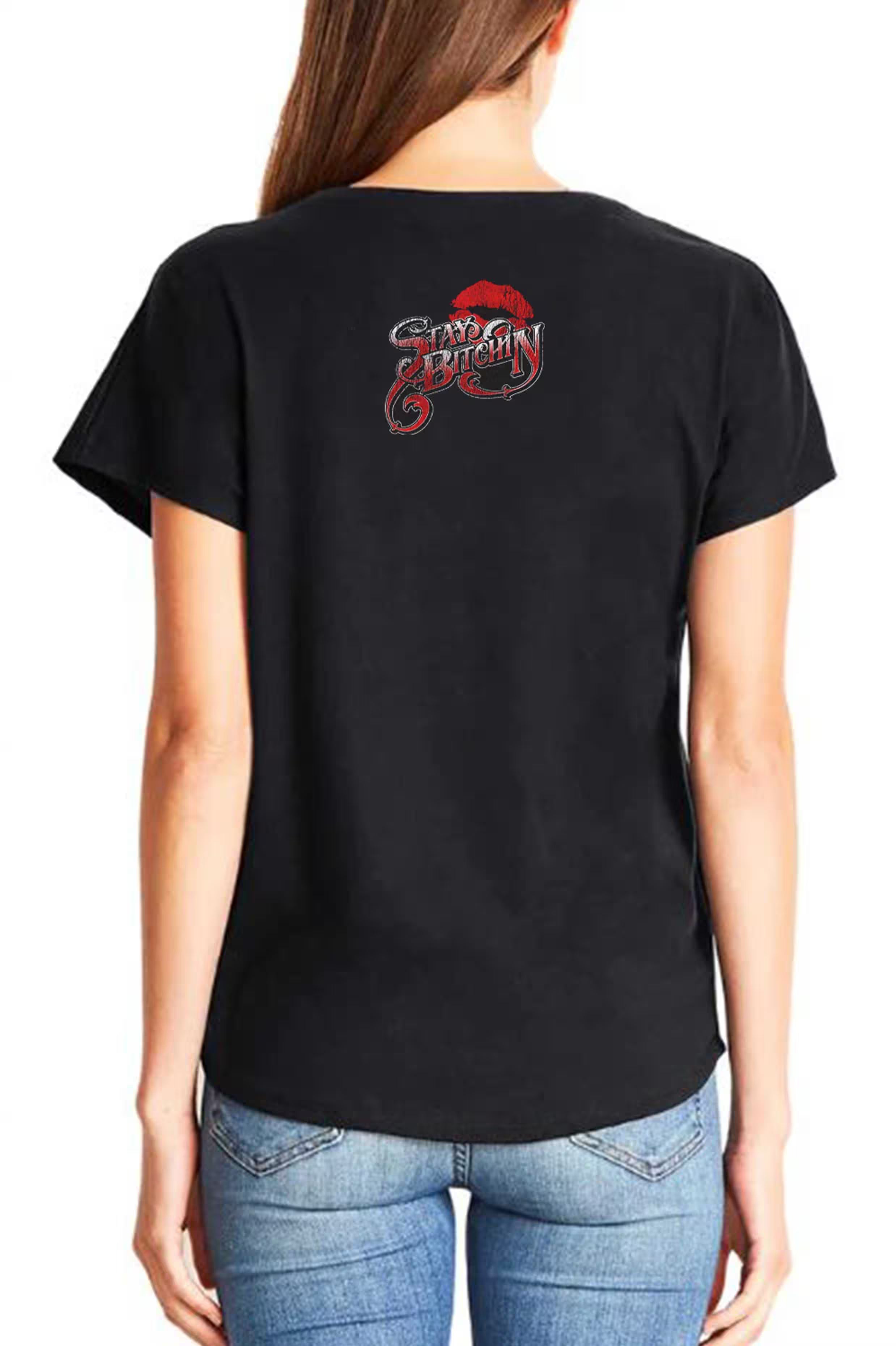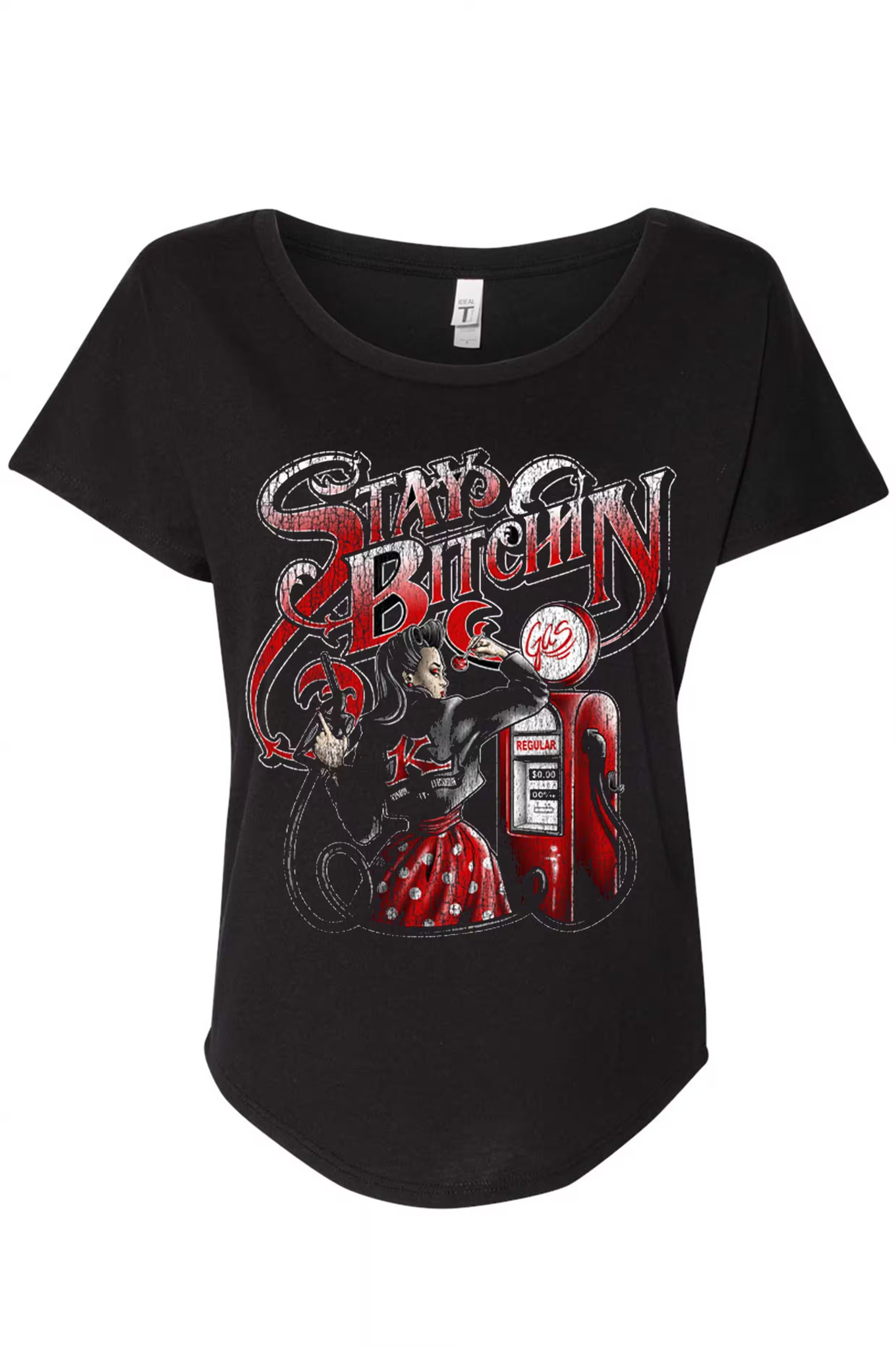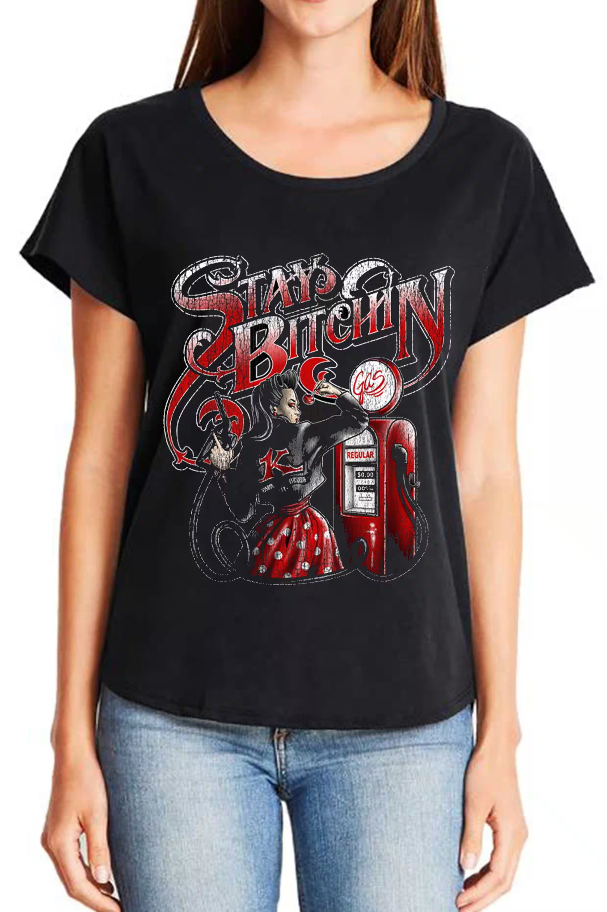 Stay Bitchin'" Relaxed Fit Scoop Neck T-Shirt! Featuring a boss babe. The print colors are red, white, and gray. The print is meant to look distressed and weathered.