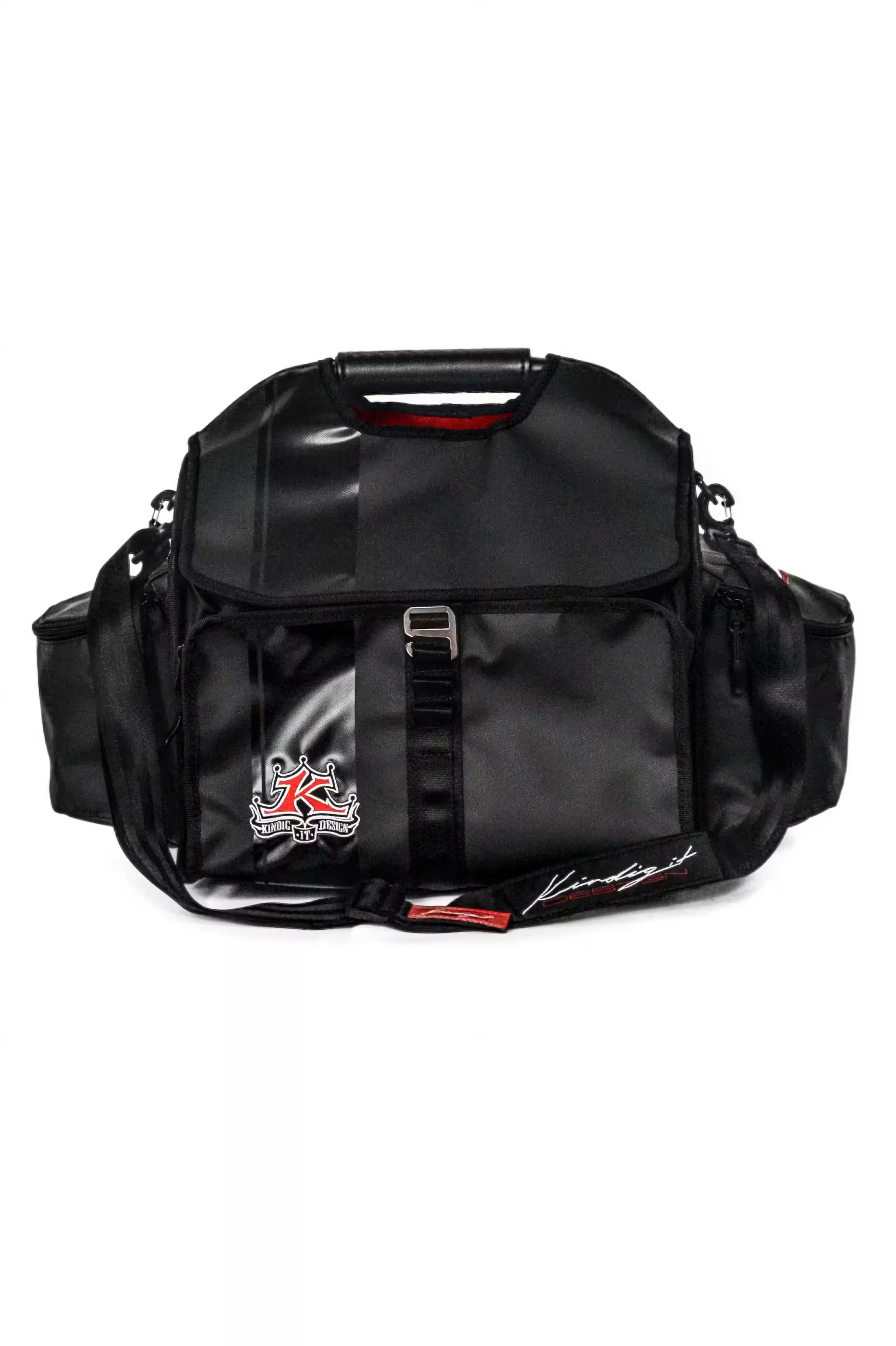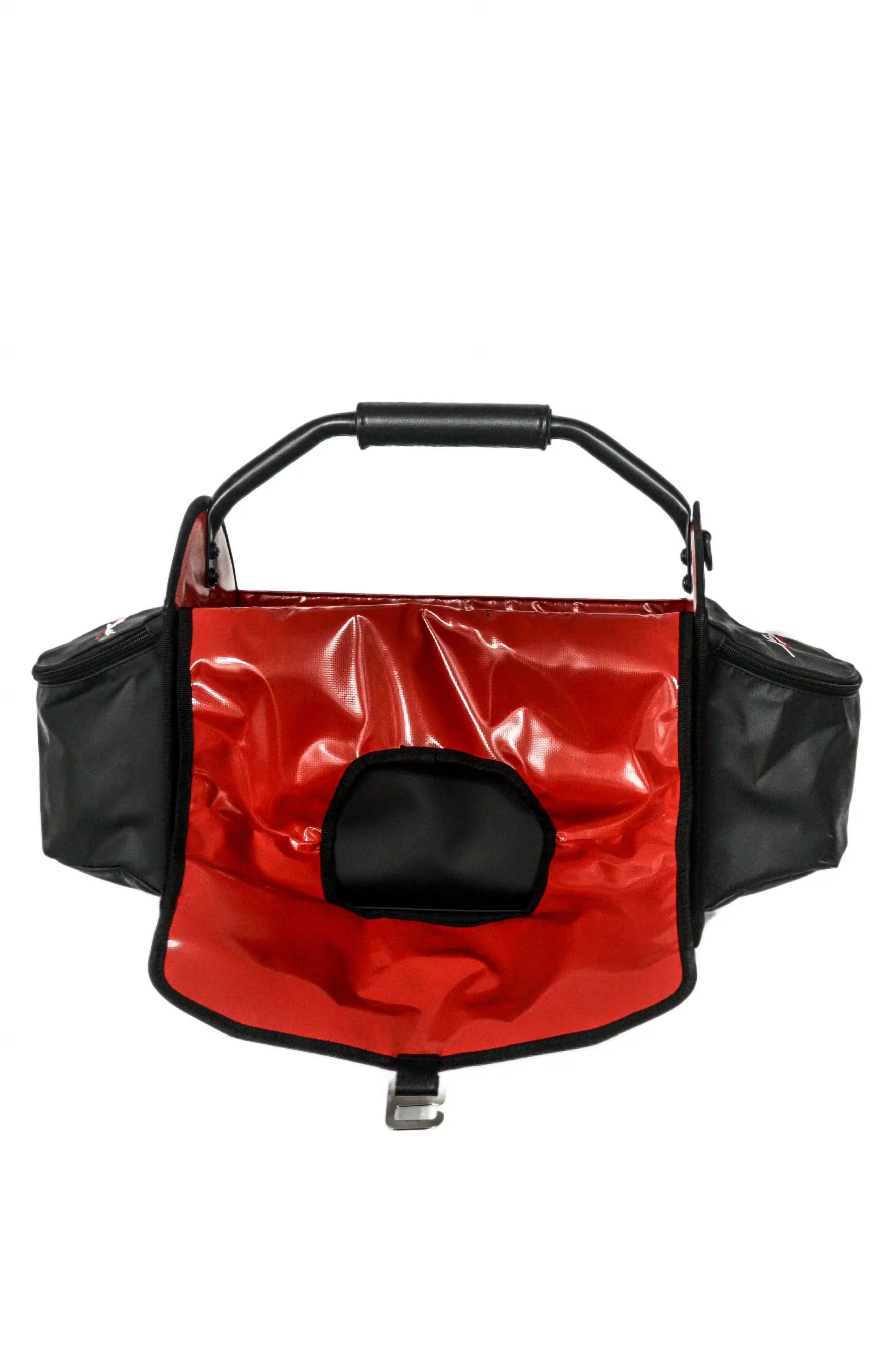 - Chrome buckled over flap covers the main compartment when transporting. Overflap stows away in back panel pocket when not in use.