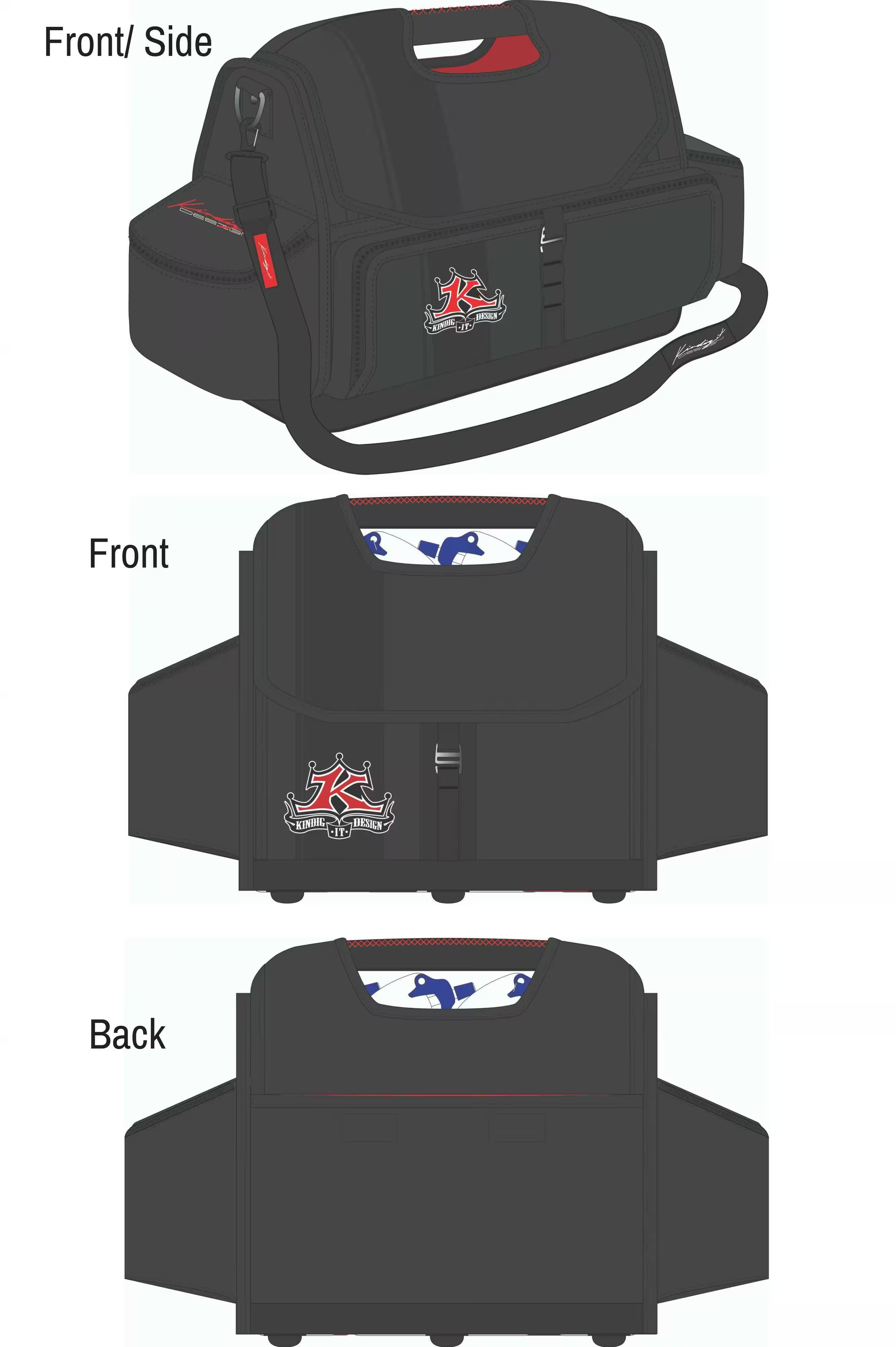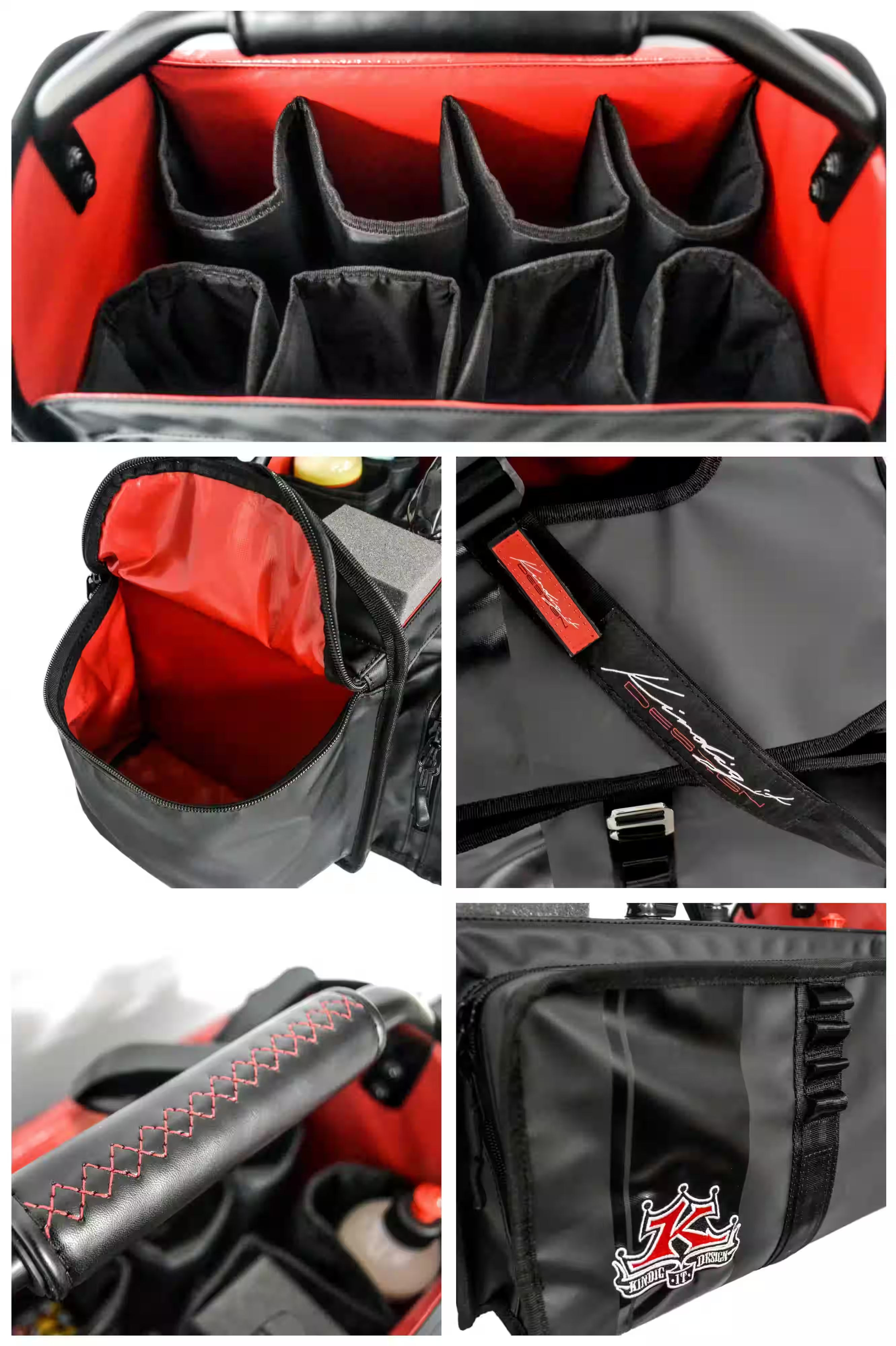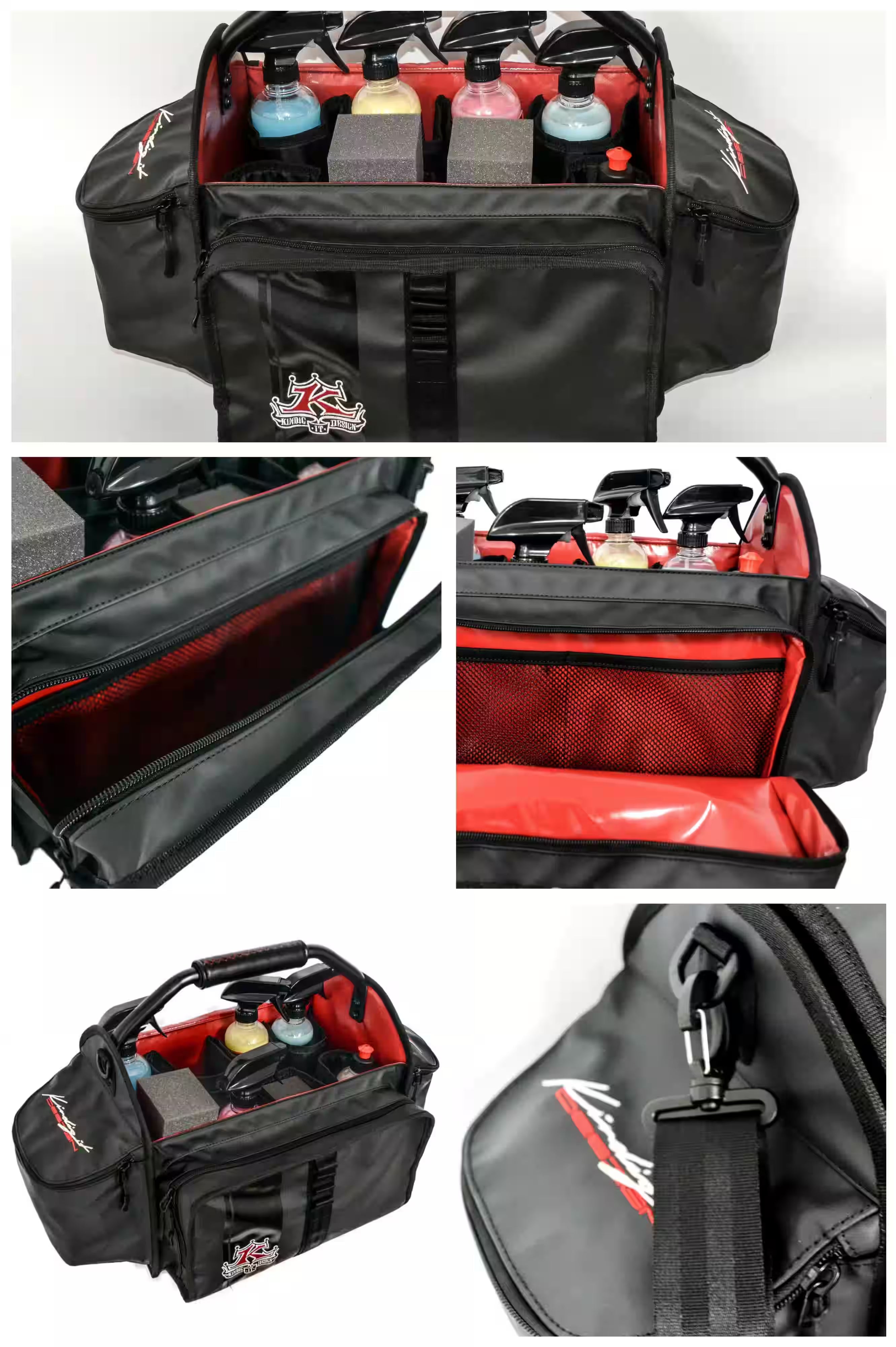 - Expansive main opening with vertical padded dividers for storing wax, detailer bottles, and window cleaners. Padded dividers can be pushed against the side walls to store larger bottles or tools for quick access.