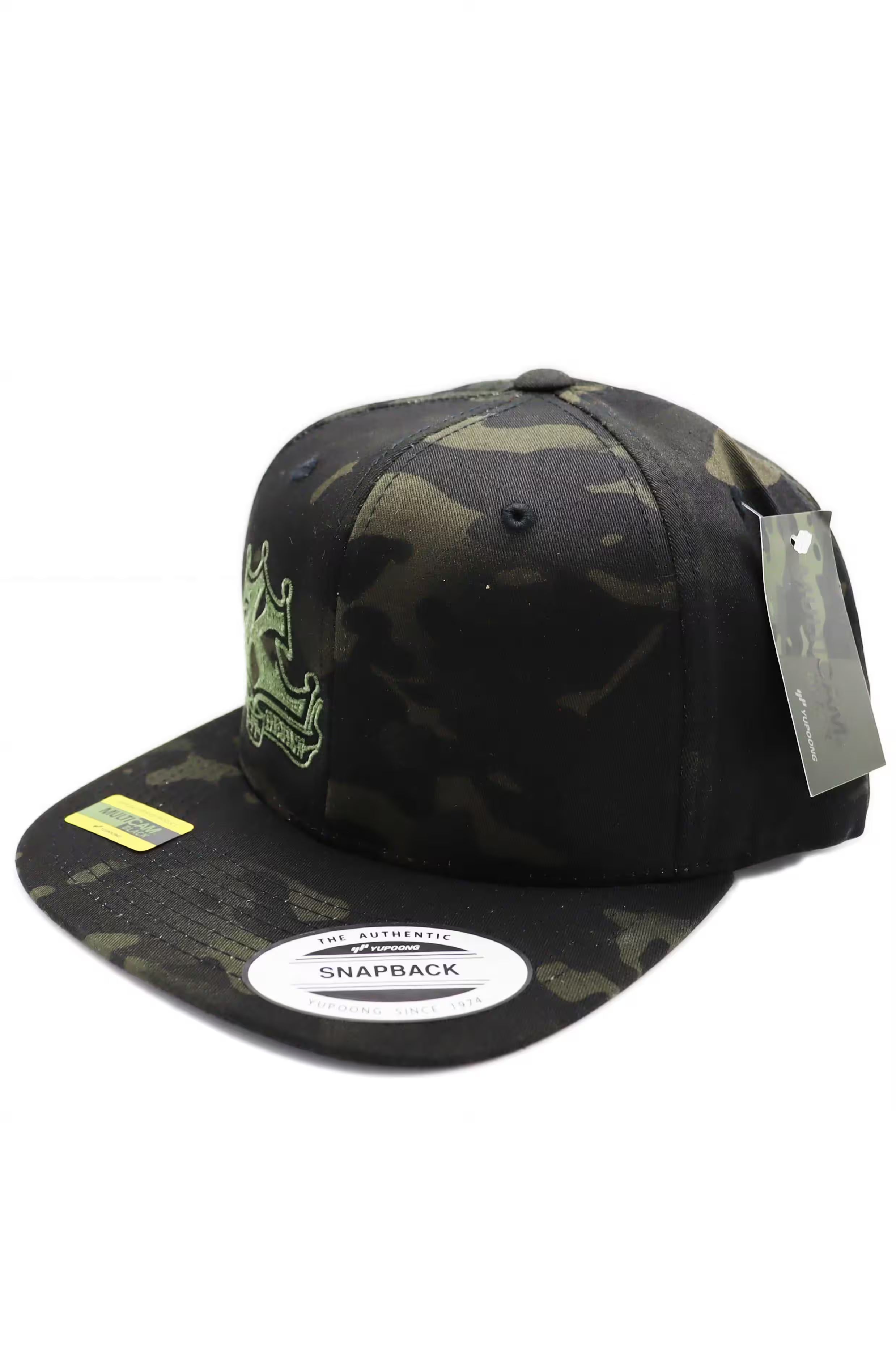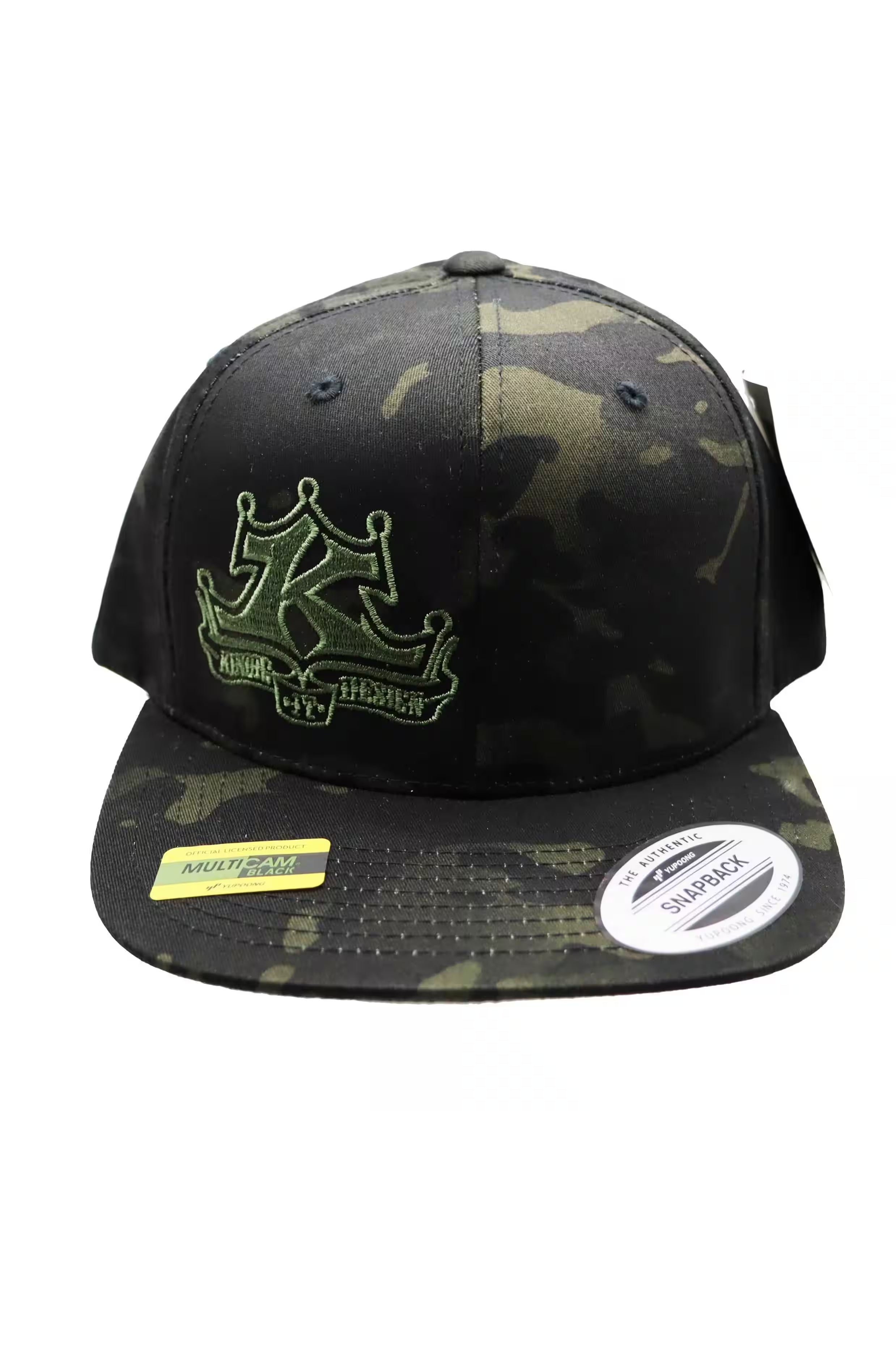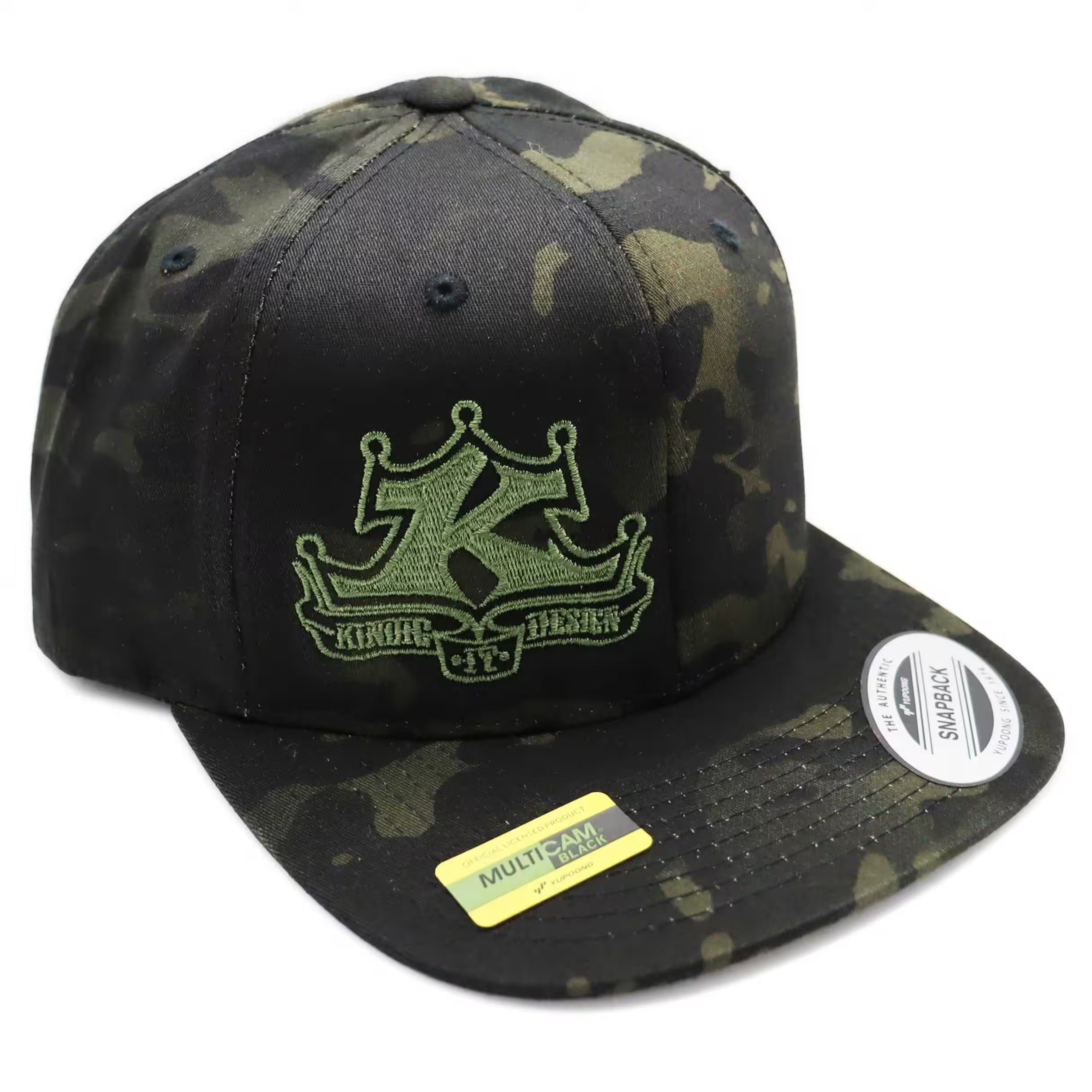Locally embroidered with a green Kindig-it Logo, this Flexfit hat is MULTICAM® BLACK in color. The 6-panel snapback hat has a high profile like a trucker hat and a flat bill.