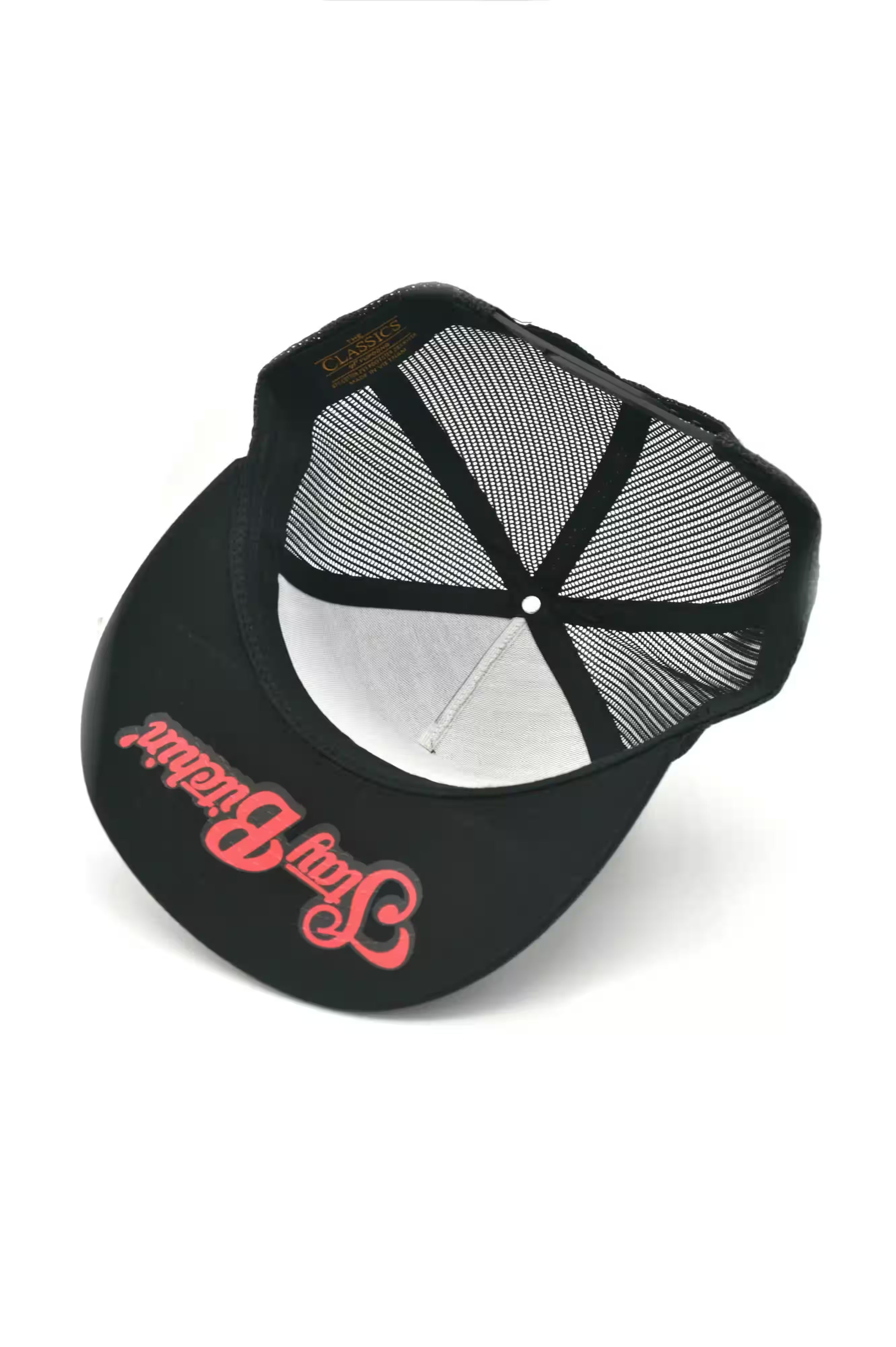 Additional Features: Strong, structured 5-panel cap with a buckram front lining, this classic mesh backing hat features a quilted comfort sweatband with a 4" crown, and 8 rows of stitching on the flat visor, with a matching plastic adjustable strap.