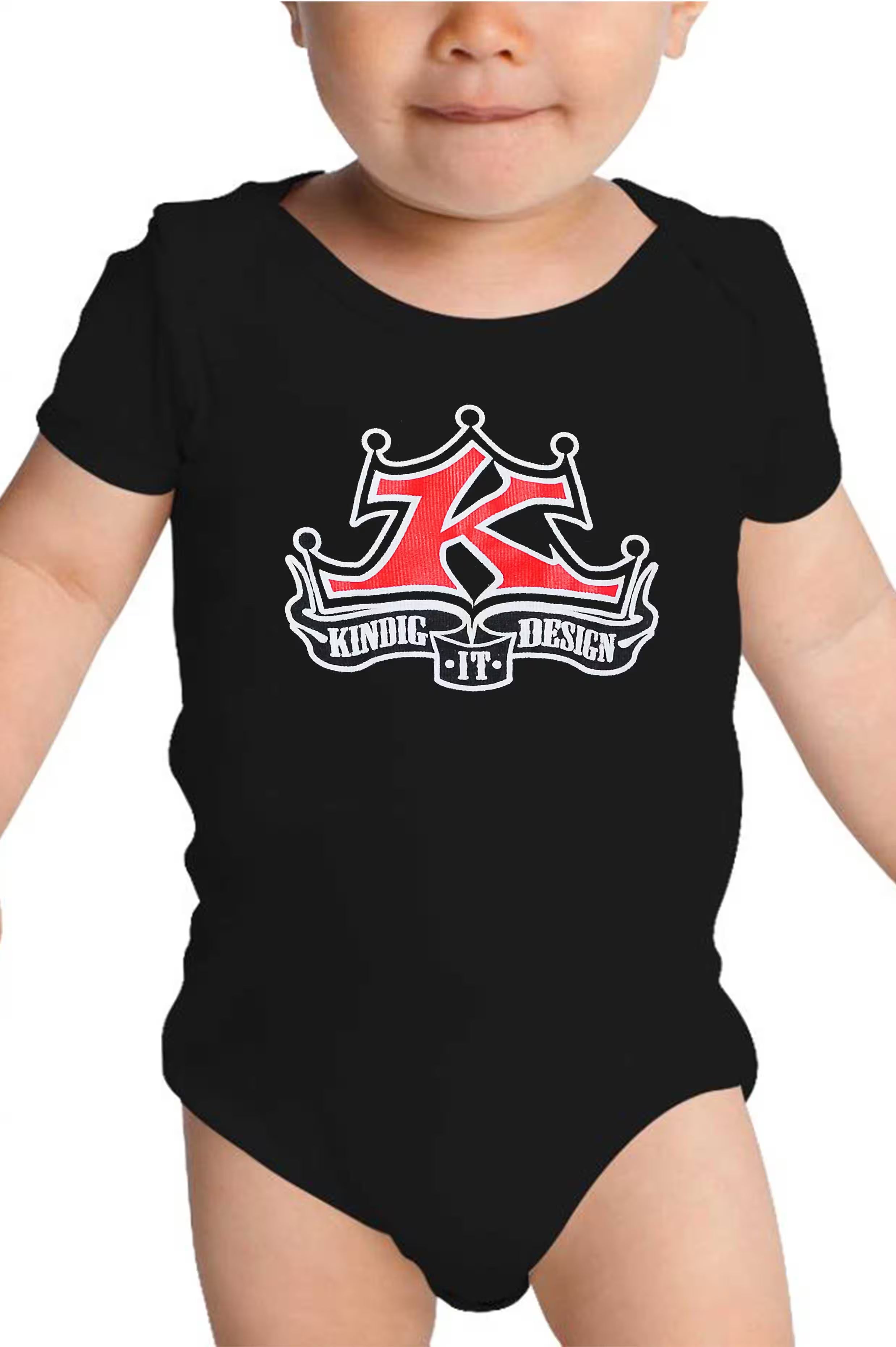 Check out these adorable onesies! These cute little baby bodysuits are black in color with a screen-printed red and white Kindig-it Logo on the front.