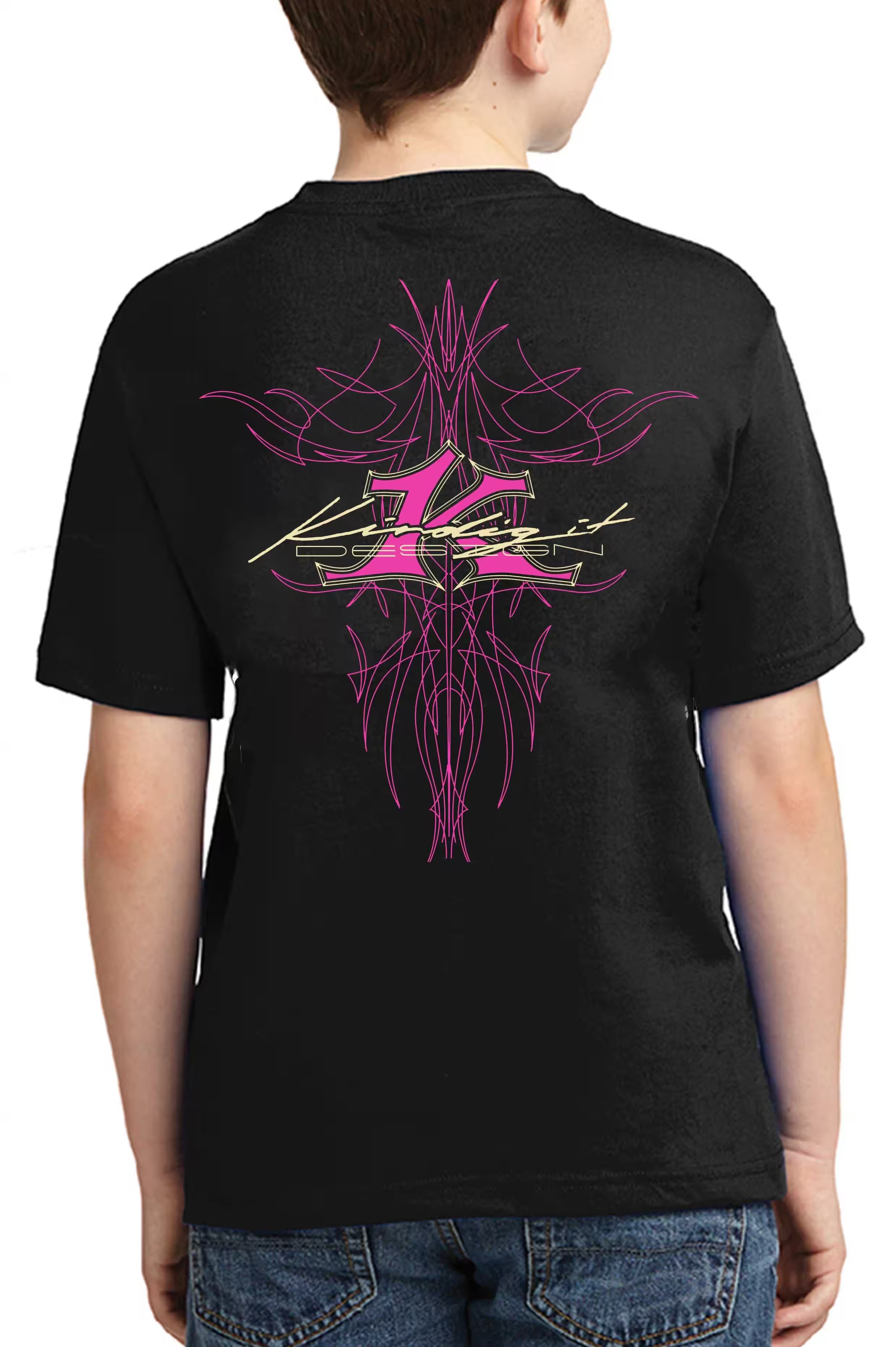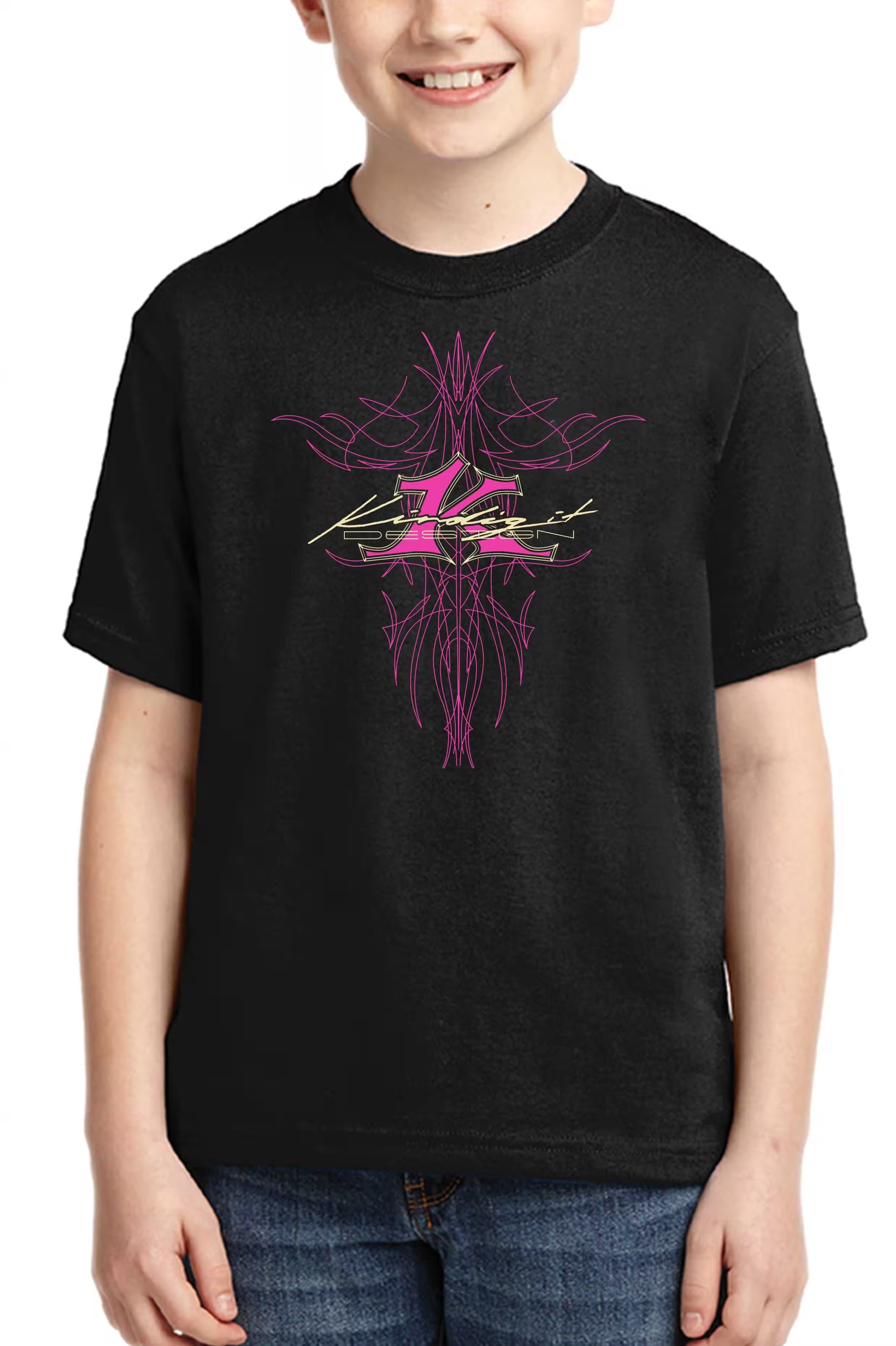 - These Cute little Hot-rodder approved shirts are perfect for your little one. Crew neck jersey shirts, black in color, with a screen-printed pink pinstripe Kindig-it logo on the front and back.