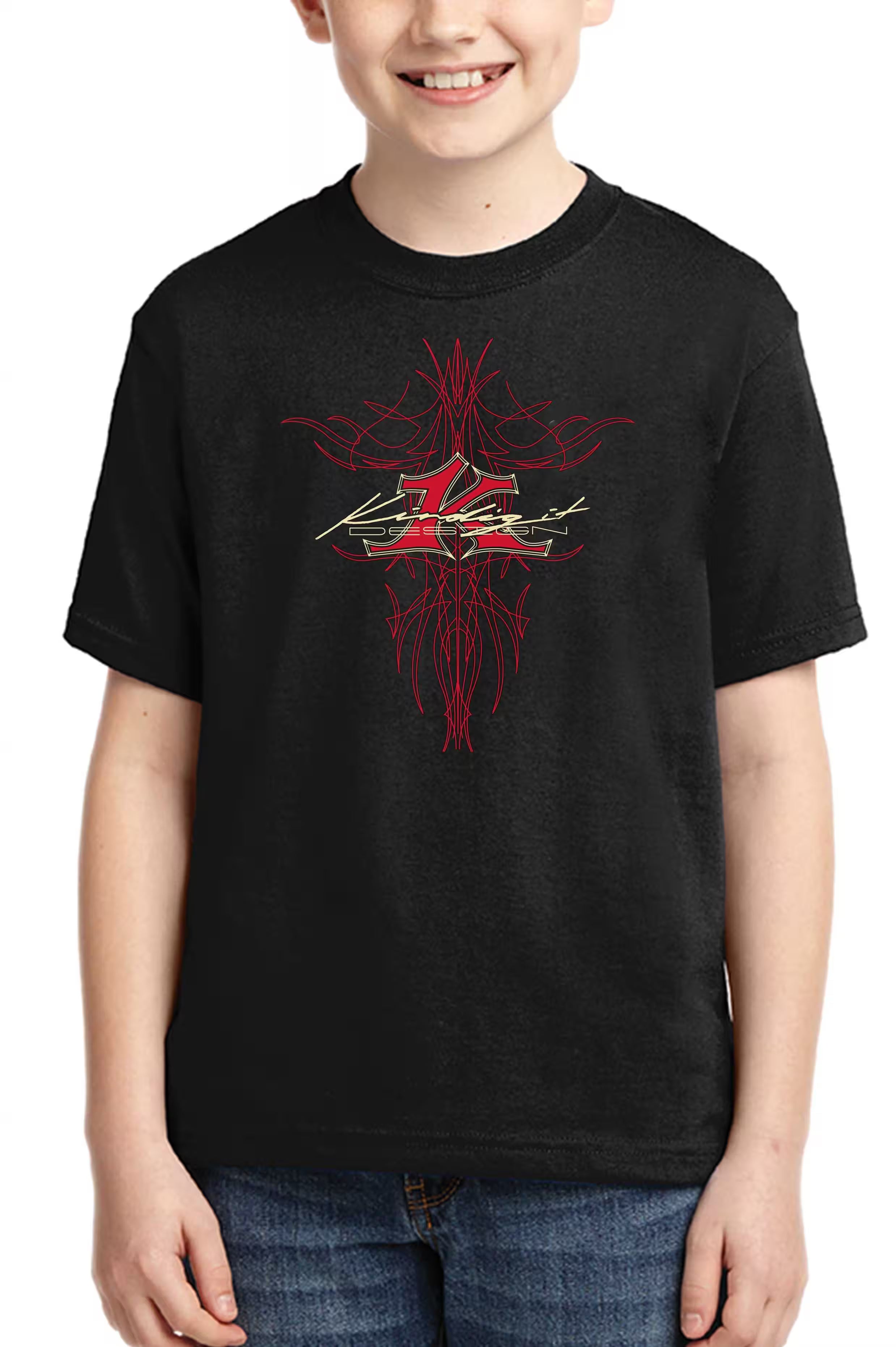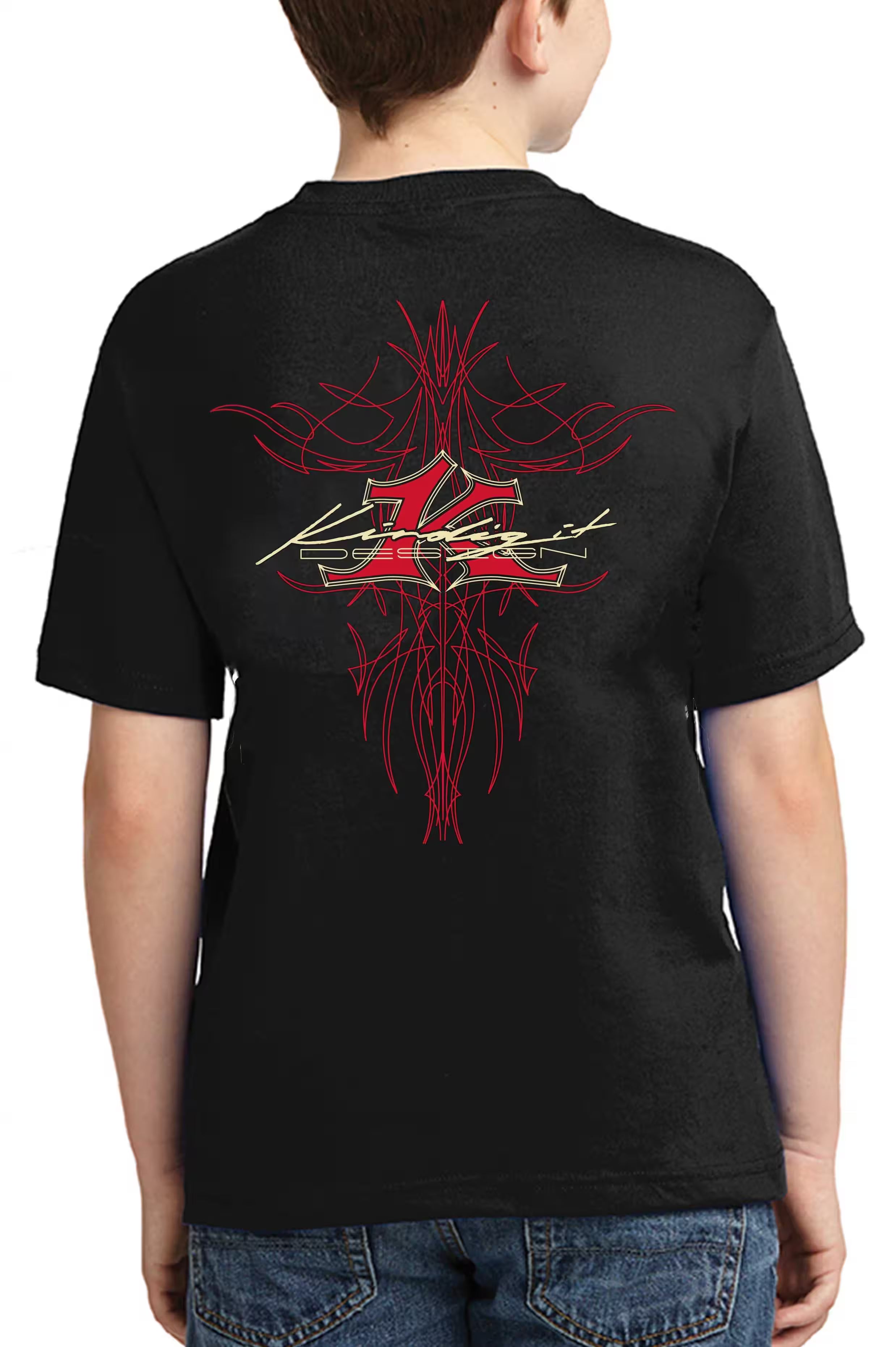 These Cute little Hot-rodder approved shirts are perfect for your little one.  Crew neck jersey shirts, black in color, with a screen-printed red pinstripe Kindig-it logo on the front and back.