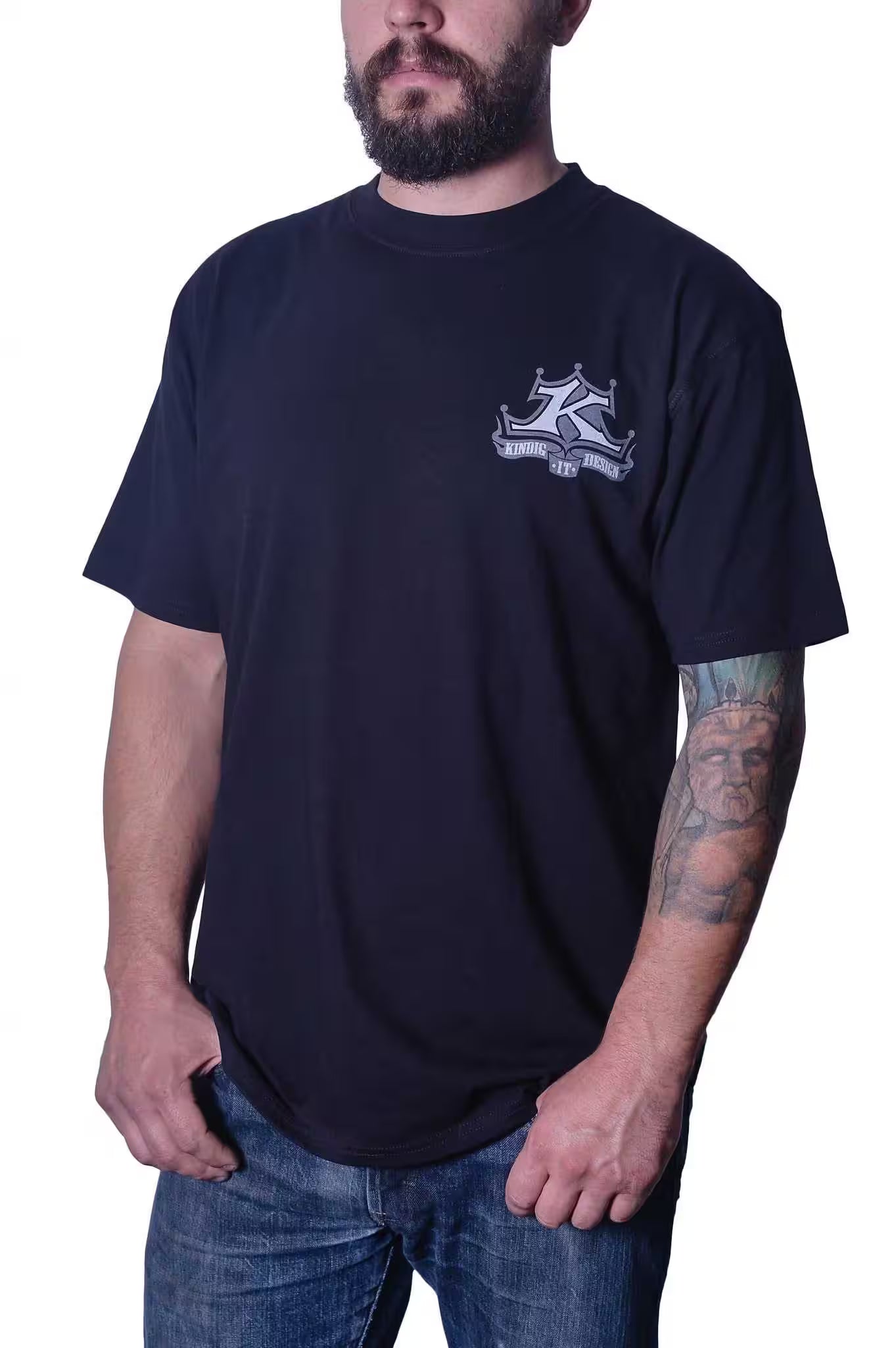 One of many from our Classic Kindig-it Series, this is our Ghosted Logo printed big on the back, and a small pocket-sized logo on the front chest. The T-Shirt is Black in color and the print is 2 shades of gray.
