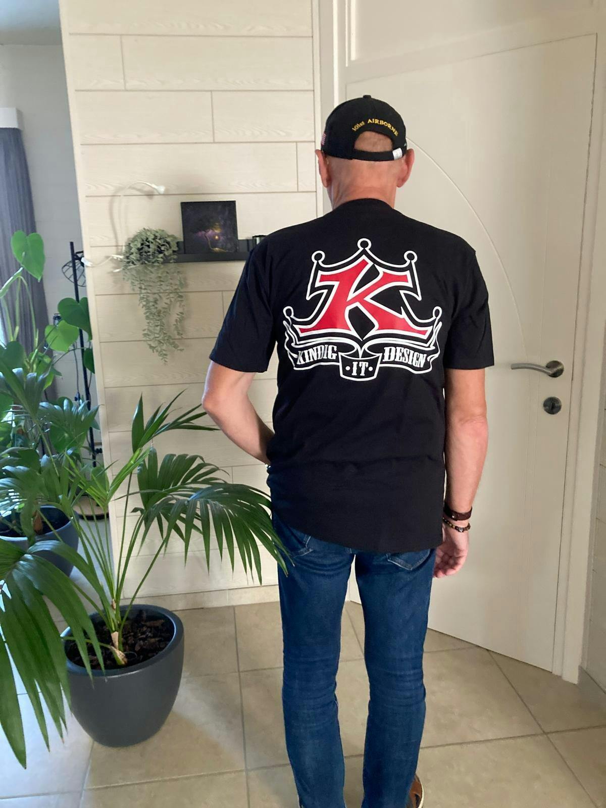 One of many from our Classic Kindig-it Series, this is our Classic Original Logo printed big on the back, and a small pocket sized logo on the front chest. The T-Shirt is Black in color and the print is Red & White.