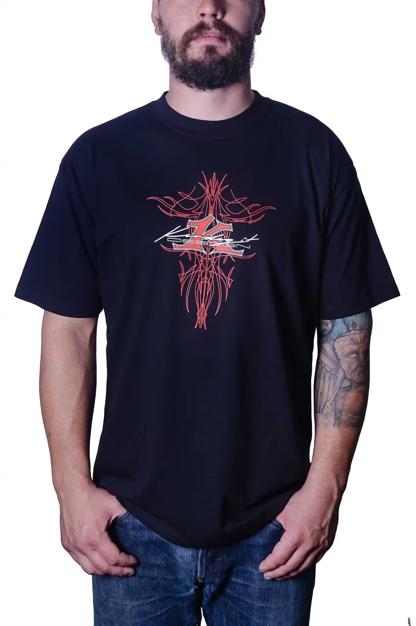 One of many from our Classic Kindig-it Series, this is our Pinstripe Logo printed big on the back and a small sized logo centered on the front chest. The T-Shirt is Black in color and the print is Red & Cream.
